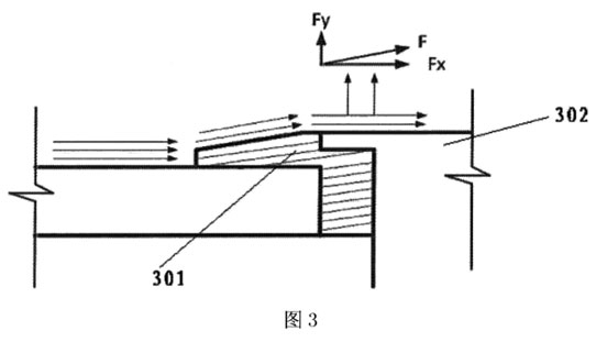 通過液體介質(zhì)流過由保護套301形成的坡面進行導流,可以產(chǎn)生一個與坡面平行的力F,這個力可以分解為水平方向的力Fx和垂直方向的力Fy,與液體介質(zhì)的流向垂直的力Fy可以減少電極頭302表面所承受的壓力,從而減少電極頭的磨損。坡面的傾斜角越大,垂直向上的力Fy也越大。但是,應該注意,坡面的傾斜角不能設置的過大,以免產(chǎn)生擾流,即,坡面的傾斜角的設置不要對液體介質(zhì)的流速產(chǎn)生影響。通常,為了確保坡面的傾斜角度,保護套的頂部不高于電極頭的頂部。