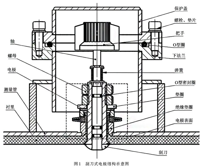 為了解決電磁流量計介質結垢的問題,目前傳統做法都是采用刮刀式機械清理的方法來解決。刮刀式電極的結構示意圖如圖1