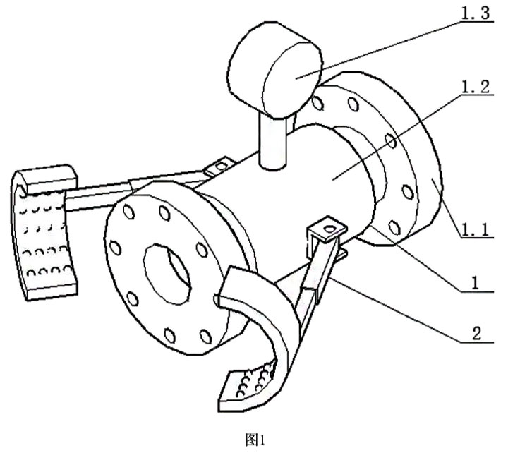 需要說明的是,在不沖突的情況下,本申請中的實施例及實施例中的特征可以相互組合。下面將參考附圖并結合實施例來詳細說明本申請。如圖1所示,一種便于安裝的電磁流量計,包括電磁流量計主體1,所述電磁流量計主體1包括法蘭盤1.1、測量導管1.2和轉換器1.3,所述測量導管1.2為水平橫向放置管道,所述轉換器1.3固定在所述測量導管1.2的上端面,兩個所述法蘭盤1.1分別位于所述測量導管1.2的左端面和右端面,還包括定位裝置2,兩個所述定位裝置2分別固定在所述測量導管1.2的前端面和后端面。所述定位裝置2主要用于所述電磁流量計主體1安裝時使用。