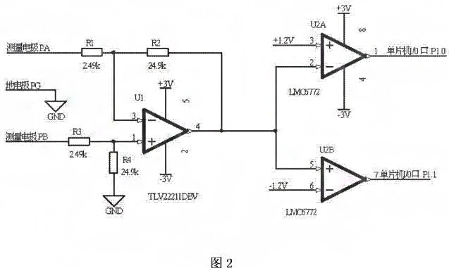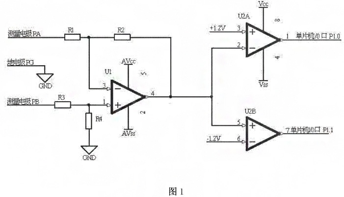 如圖2所示,測量電極PA與電阻R1的一端連接,電阻R1的另一端與電阻R2的端、運算放大器u的反相輸入端3腳連接,電阻R2的另一端與運算放大器U的輸出端4腳、雙路比較器通道一U2A的反相輸入端2腳、雙路比較器通道二U2B的同相輸入端5腳連接,測量電極PB與電阻R3的一端連接,電阻R3的另一端與電阻R4的一端、運算放大器U的同相輸入端1腳連接,電阻R4的另一端與地連接,地電極PG與地連接,運算放大器U1的電源供電端5腳與正電源+3V連接,運算放大器U1的接地端2腳與負電源-3V連接,雙路比較器通道一U2A的同相輸入端3腳與+1.2V連接,雙路比較器U2A的電源供電端8腳與正電源+3Ⅴ連接,雙路比較器υ2A的接地端4腳與負電源-3V連接,雙路比較器通道U2A的輸出端1腳與單片機的I/0口P1.0連接,雙路比較器通道二U2B的反相輸入端6腳與-1.ΣV連接,雙路比較器通道二U2B的輸出端7腳與單片機的I/0口P1.1連接工作原理:電阻R1與電阻R3相等,電阻R2與電阻R4相等,且電阻R1為10倍電阻R2;電阻R1、電阻R2、電阻R3、電阻R4、運算放大器U1組成了一個差分放大電路,放大倍數為10。當測量電極PA電位等于測量電極PB電位時,雙路比較器通道一U2A的反相輸入端2腳和雙路比較器通道二U2B的同相輸入端5腳的電位為零,雙路比較器通道一U2A的輸出端輸岀高電平,雙路比較器通道二U2B的輸岀端輸岀高電平。當測量電極PA電位高于測量電極PB電位120m時,雙路比較器通道一U2A的反相輸入端2腳和雙路比較器通道U2B的同向輸入端5腳的電位大于+1.2V,雙路比較器通道一U2A的輸出端輸出低電平,雙路比較器通道二U2B的輸出端輸出高電平。反之,當測量電極PA電位低于測量電極PB電位12σmV,雙路比較器通道一U2A的反相輸入端2腳和雙路比較器通道二U2B的同相輸入端5腳的電位小于-1.2V,雙路比較器通道一U2A的輸岀端輸岀高電平,雙路比較器通道二U郾B的輸出端輸岀低電平。雙路比較器通道一U2A的輸岀端和雙路比較器通道二U2B的輸出端分別連接單片機的1/0口P1.0和P1.1,通過I/0口P1.0和P1.1的高低電平的檢測實現電磁流量計測量電極兩端是否存在極化電壓和極化電壓極性的檢測。