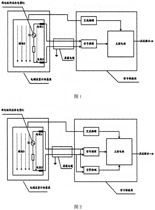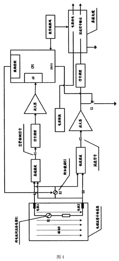 圖1是一種原有電磁流量計的電路結構示意圖圖2是一種原有帶空管檢測的電磁流量計的電路結構示意圖圖3是一個電極與地之間施加空管檢測信號的電磁流量計的電路結構示意圖圖4是兩個電極之間施加空管檢測信號的電磁流量計的電路結構示意圖五、具體實施方式見圖1示意圖中,電磁流量計傳感器在交流勵磁下,產生交變磁場,導電流體在交變磁場中切割磁力線產生感應電勢E1,通過屏蔽電纜輸出至遠端信號轉換器的主控制電路板,在主控制電路板上輸出流速信號并顯示見圖3、圖A示意圖中,由CPU控制口產生周期為16us的高頻激勵,經模擬轉換為高頻正弦激勵E2,該i正弦激勵直接施加在,電磁流量計傳感器的其中一個電極與地或者是兩個電極之間,(圖3是一個電極與地之間施加空管檢測信號的電磁流量計的電路結構圖,圖4是兩個電極之間施加空管檢測信號的電磁流量計的電路結構圖):由此產生被測流體內阻R1的測量信號U1,該測量信號U1與流體內阻R1成線性關系U1=K*R1(K為已知系數),不可避免的是流體內阻測量信號與流體流速測量信號同時存在,二者混在一起,再經過高通濾波電路將空管檢測信號提取出來,此時對流速信號衰減在604B以上,經CP實時采樣并經過數字濾波后,與設定的閱值(可調參數)相比較,若判斷為空管,則v發出zcro信號,立刻閉合開關K1關閉流速測量信號,使信號轉換器顯示為零,否則斷開開關K正常輸出流速信號。而電極上流速測量信號經過低通濾波電路,此時對空管檢測信號衰減60u8以上,再經過信號調理電路后輸出流速信號,實現與空管檢測信號相互分離,從而保證流速測量的準確度008]見圖2示意圖中,是一種原有的帶空管檢測的電磁流量計的電路結構圖,由于電纜分布電容的影響,該分布電容對高頻率的空管檢測信號有一定的損耗,特別是長距離的屏蔽電纜,會直接影響到空管檢測信號對于流體電導率的測試,所以該結構并不適合,本實用新型提出的高頻率信號空管檢測方式。結合圖3和圖4可以看出為了保證微弱的空管檢測信號不失真的傳輸,空管檢測裝置就近放置于傳感器出線處(傳感器內部),進行信號處理后再通過屏蔽電纜傳輸,從而解決了高頻率空管檢測信號對電纜分布電容大小的要求009由于電磁流量計傳感器與信號傳換器之間通常只有用于傳輸流速信號的二芯屏數電纜,并沒有低壓直流電源供給電纜,為了滿足通用的安裝習慣,不對空管檢測裝置另外增加供電電纜,空管檢測裝置的供電電源使用二芯屏蔽電纜的其中一根導線進行供電,另外一根導線用于傳輸經過調理后的流速信號;實現直流供電與信號傳輸共用一根二芯屏蔽電纜0020根據不同的使用環境,信號傳換器需要調整空管檢測裝置的空管閱值參數設置時,則使用數字信號調制方式,該信號疊加在供電電源的電纜上進行傳輸,方便在現場調整空管檢測裝置的參數,滿足不同的使用條件。由于數字編解碼是已知的技術,所以在這里不詳細進行說明