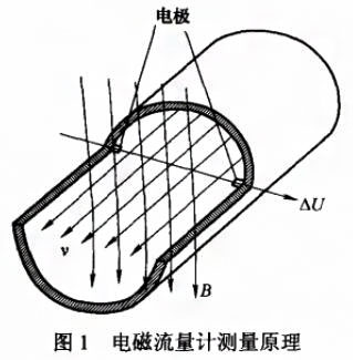電磁流量計測量原理如圖1所示,管道內流動的導電液體切割磁力線,將在兩端電極間產生電勢差ΔU,ΔU與磁通量密度B、液體流速ν符合弗來明右手定則。只要管道內部流場理想、磁場穩定,△U的大小與管道內介質平均流速成嚴格的線性關系,從而通過測量ΔU的大小可確定管道內介質流量。