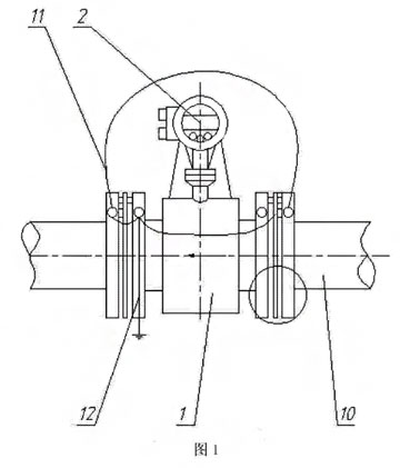 根據實施例1所述的分體式電磁流量計,所述的傳感器兩端用螺栓5、螺母6、墊圈7、彈簧墊圈8、絕緣襯套9固定安裝在被測管道10上,所述的被測管道之間、所述的傳感器與被測管道之間、傳感器與接地環之間用連接導線11連接,所述的連接導線與測量接地導線連12接。