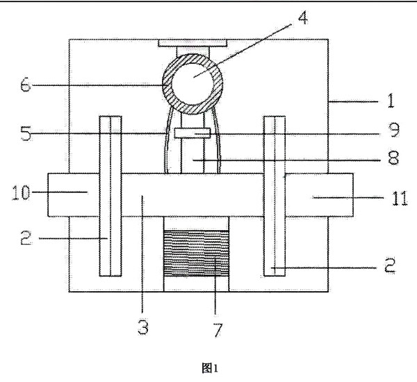 本實用新型抗震型旋進旋渦流量計將進氣口10和出氣ロ11分別通過連接頭2與殼売體3連接,將流量顯示器4通過旋進螺栓9連接在連接桿8上,再將彈簧7安裝在殼體3底部,將連接桿8包裏在流量顯示器4外側,以達到保護旋進旋渦流量計的目的,箱體1作為旋進旋渦流量計第 一道保護措施,連接桿8和彈簧7作為旋進旋渦流量計第 二道保護措施,兩者相互配合使用共同保護旋進旋渦流量計。