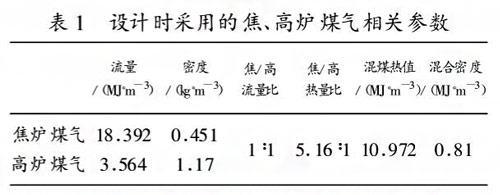 實際生產上采用的焦爐、高爐煤氣的配比為百分之四十一左右,有時甚至更低?,F以配比為百分之四十ー為例,相關參數如表2